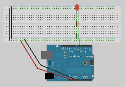 Now that we have used a potentiometer lets use the value to vary the delay between turning an LED on and off. Create the circuit below and then upload the following code onto the Arduino. The code is an example available with the Arduino ide found under 3.Analog/AnalogInput.
