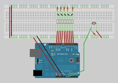 The potentiometer generated a value from 0-1024 a even range to use as an input. Most sensors do not generate such a nice range of values under normal working conditions. To accurately map a sensor you need to now what the thresholds of the sensor. Each sensor will have a minimum and maximum threshold. Lets use a photocell to change the brightness of an LED. To do this first we will need to determine the minimum and maximum threshold of the photocell. Create the circuit below and then upload the following code onto the Arduino.